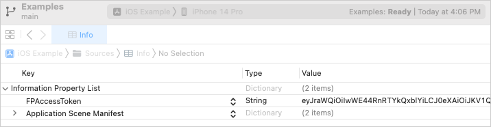 With these instructions, you can configure the access token for iOS development projects that rely on React Native. You must update your target's Info.plist file.