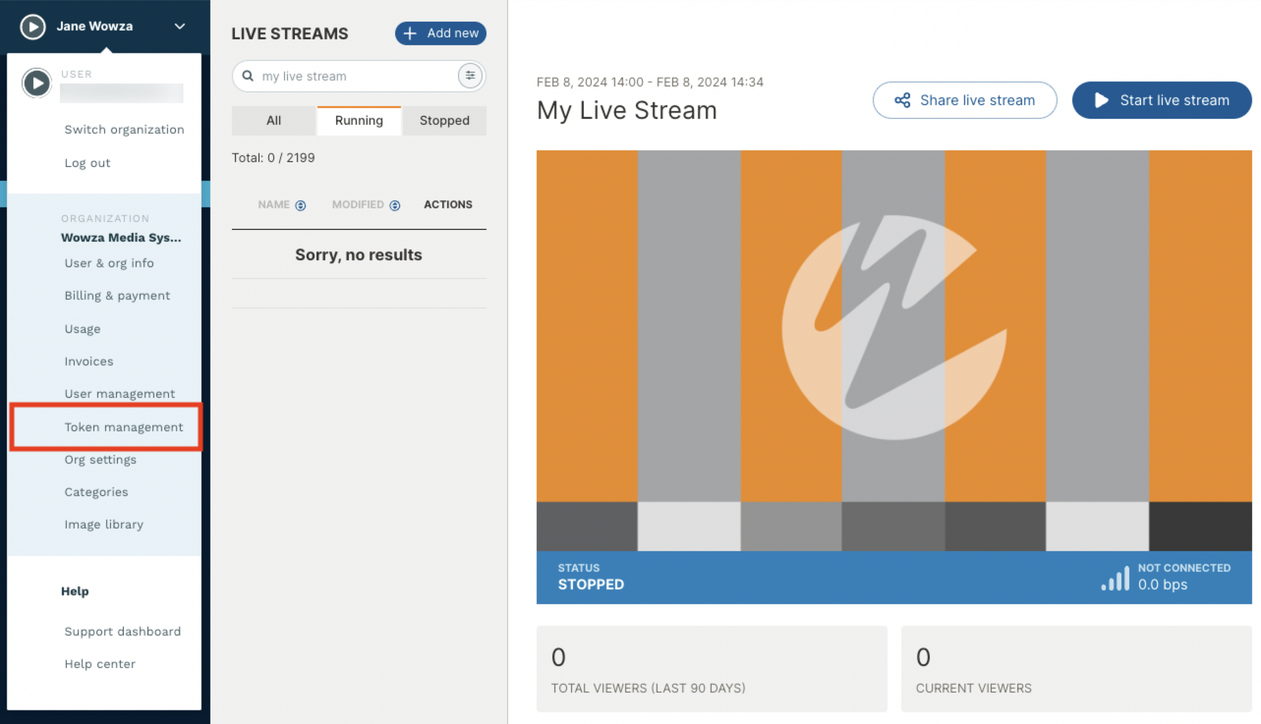 - Personal access tokens — Available to all users with a Wowza Video license. These tokens are specific to a user and can be used in API calls to do quick tests or manual actions that don't need to persist if the user leaves the organization.